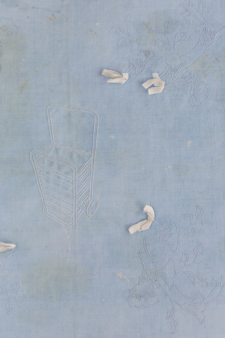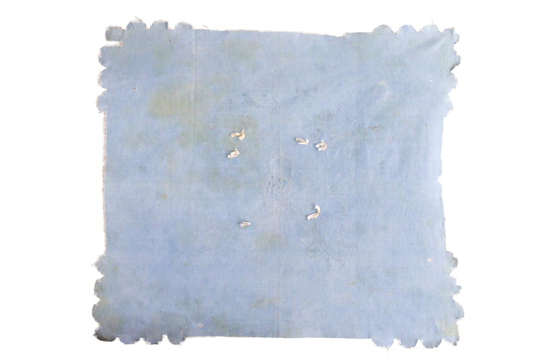Un mantel bordado a mano con pericia, heredado en una cadena de afectos que al volver a marcarse continúa y revaloriza su procedencia. El textil indica un uso que roza el descuido en sus marcas, manchas y roturas; un uso continuado como objeto utilitario, sobre una mesa que no está pero donde se come a diario.