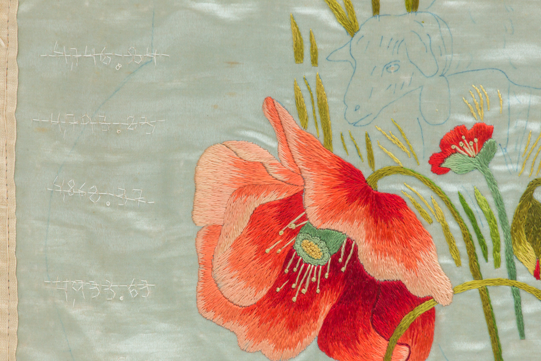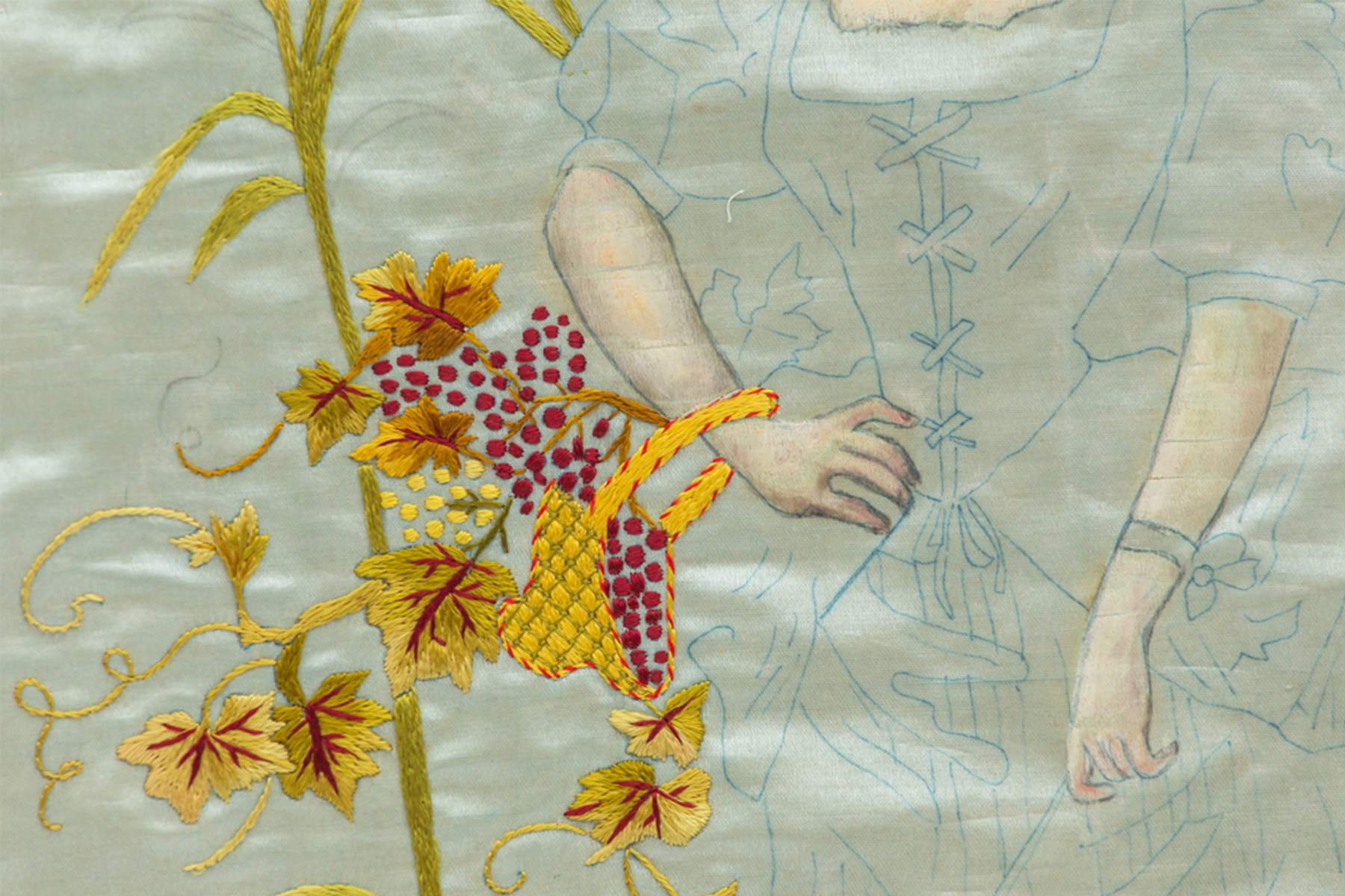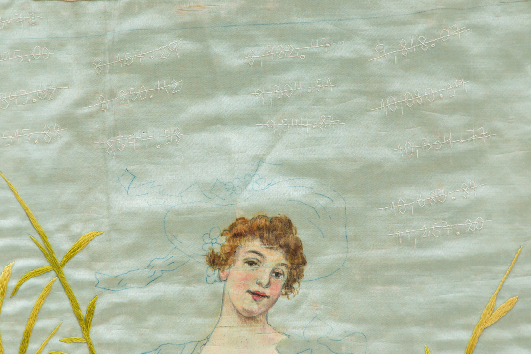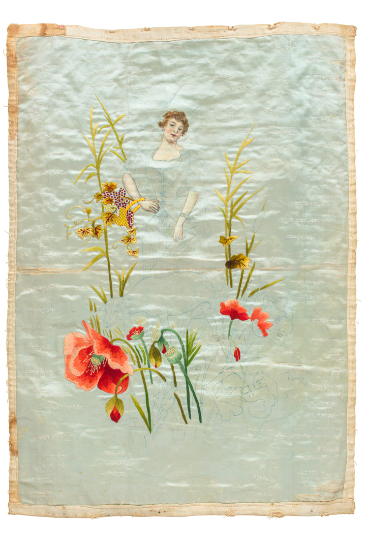 Los textiles son también dispositivos semánticos. Una imagen a medio terminar de una mujer: como sostén, base material de alimento y cuidado; una representación que persiste, que no cambia. Un estilo que se copia. Una visión importada de una ficción que se sostiene, derruida, deslucida; el adorno y la pompa del bordado sobre seda para embellecer. Los números que sí cambian periódicamente son apuntes en la tela, un gesto cotidiano repetido que recorre el período entre 2017 y 2022. Las cifras bordadas como marcas de permanencia que se pierden y tachan.