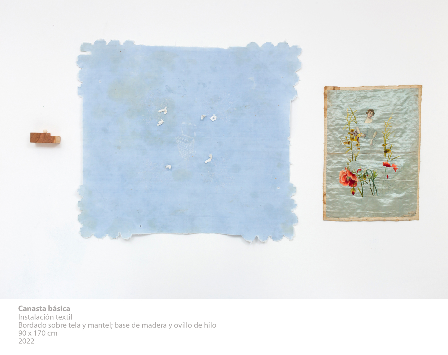 Canasta básica es una instalación que ensambla materiales textiles de distintos usos, procedencias y temporalidades. El material textil es soporte, lenguaje y testimonio que conecta con nuevos sentidos en el tiempo presente. Las mismas telas se vuelven a bordar y resignificar.