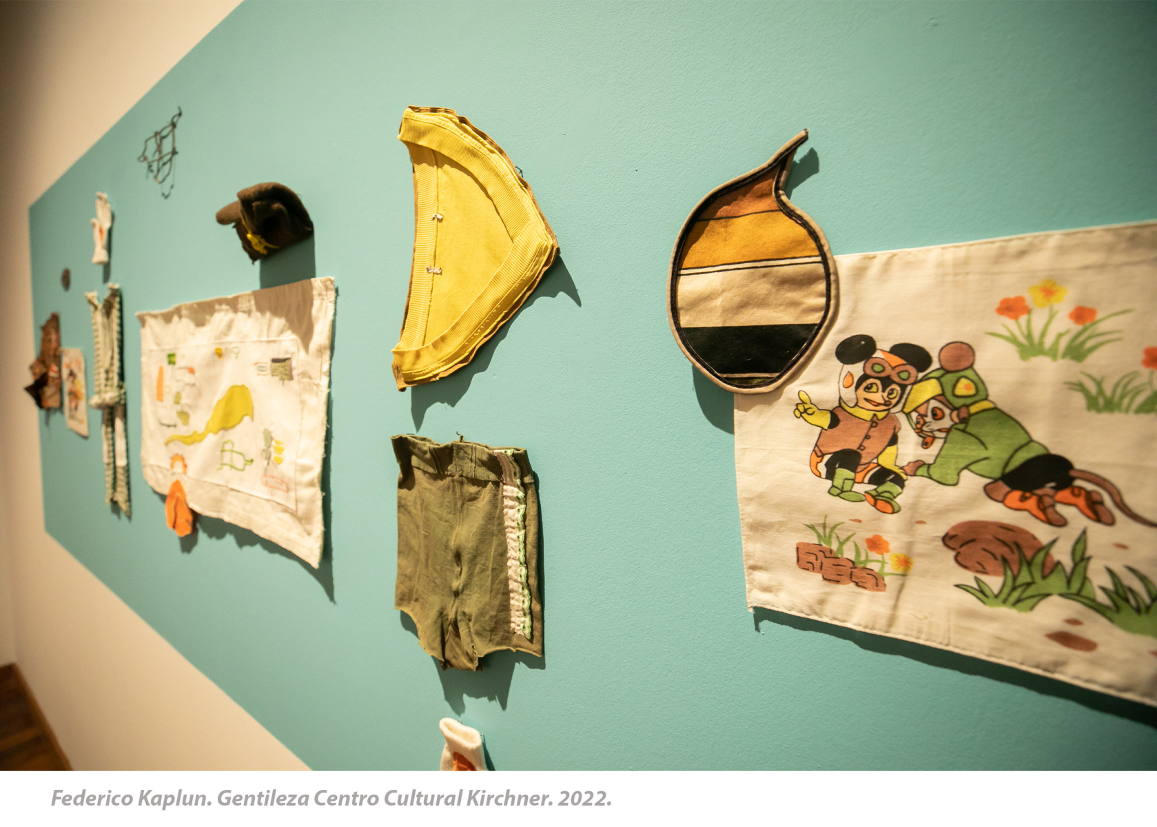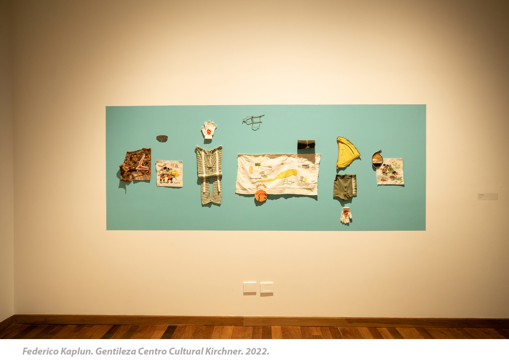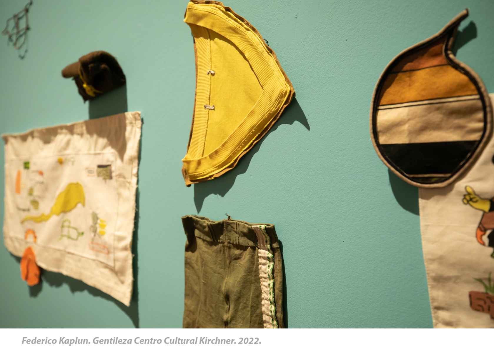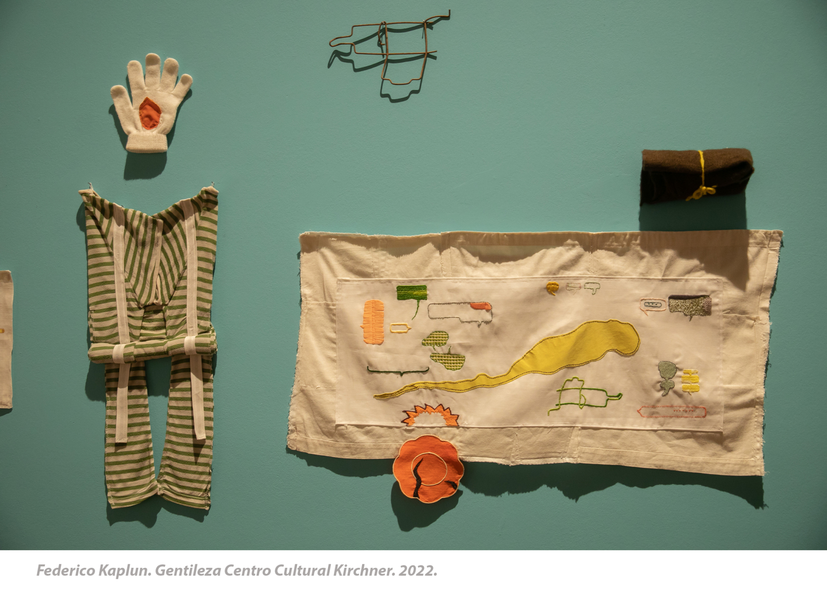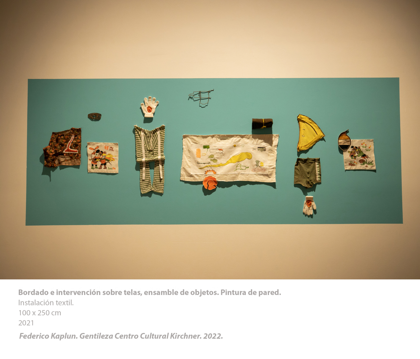 Conviven en la instalación la política del rescate de los materiales y el trabajo emocional alrededor del uso de prendas, junto con las posibilidades del bordado, el uso de parches y las formas de las piezas textiles como un lenguaje en sí mismo.