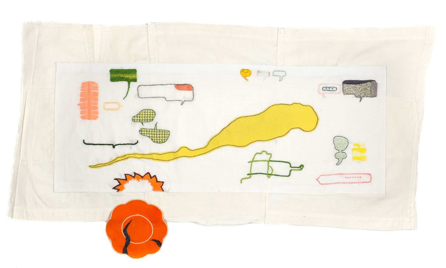 Ejercicio Nº 1 es una instalación textil producida en los cruces del dibujo, el bordado, la costura a máquina, la reutilización y resignificación de materiales.