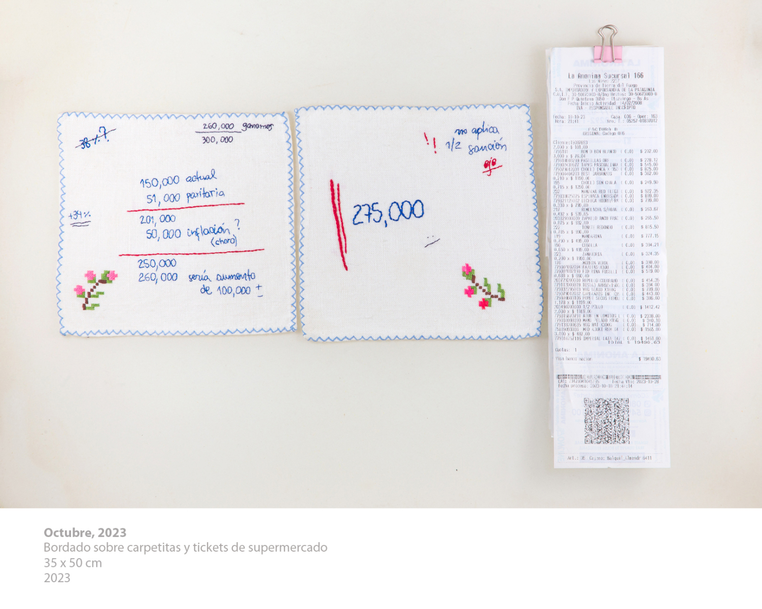 Octubre, 2023 nos habla de la potencia del textil para conectar la memoria individual y colectiva. Como en otro grupo de trabajos previos -La semana, Canasta básica, La feria o Kit de supervivencia-, los temas que se abordan tienen que ver con la economía doméstica: cómo sostenemos en lo inmediato la base material de nuestras vidas. Cómo sobrevivimos.