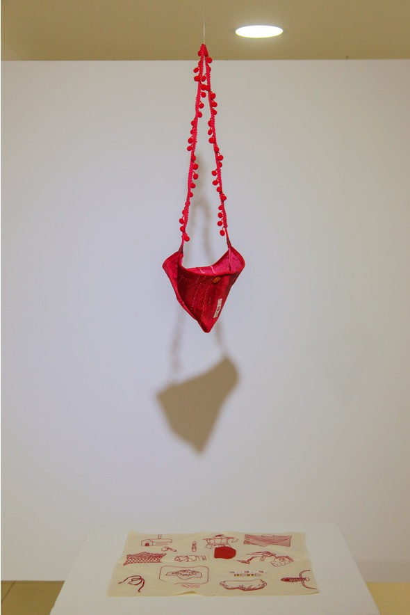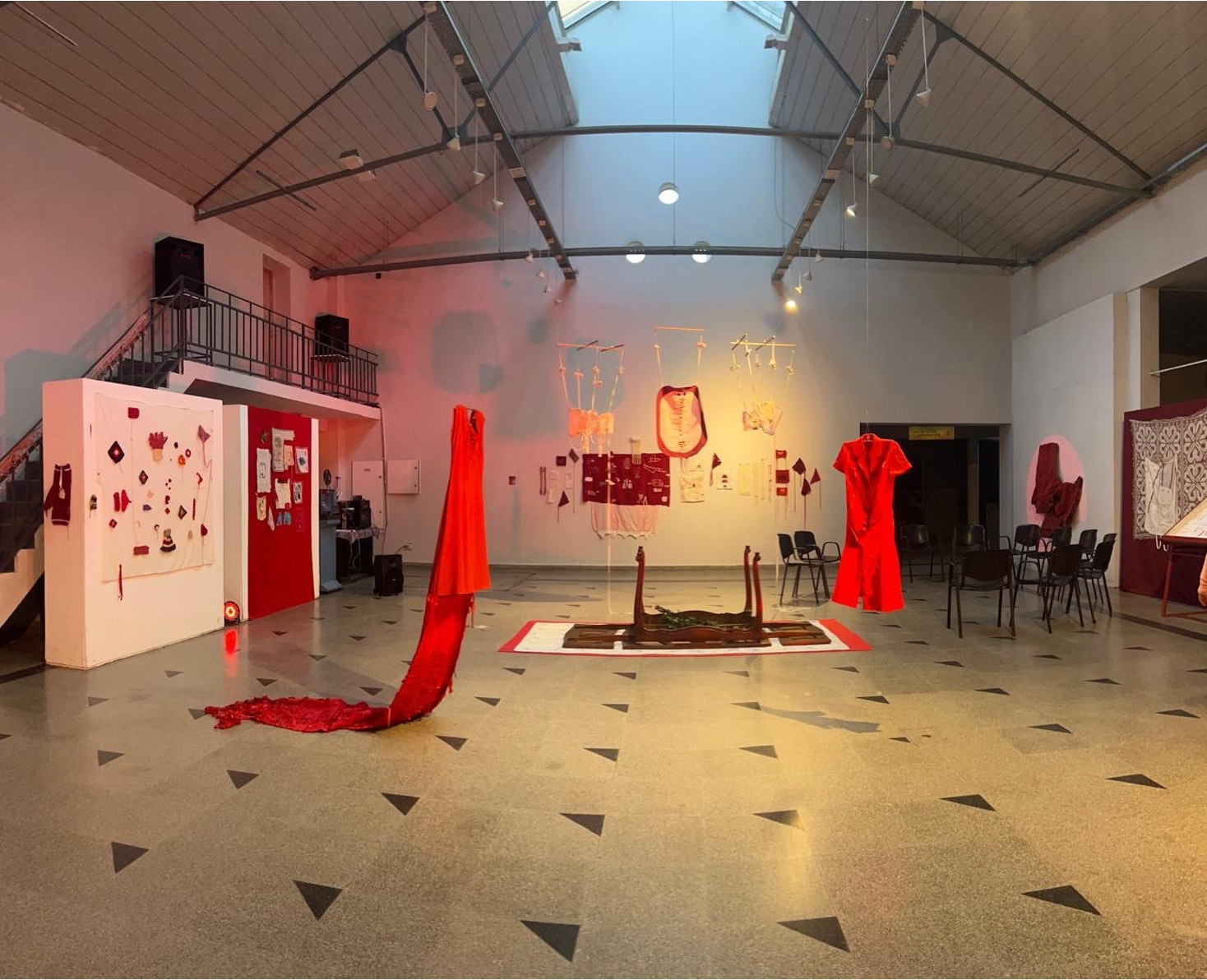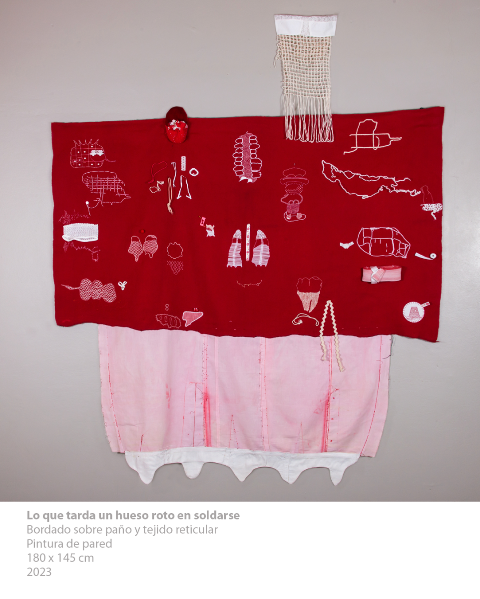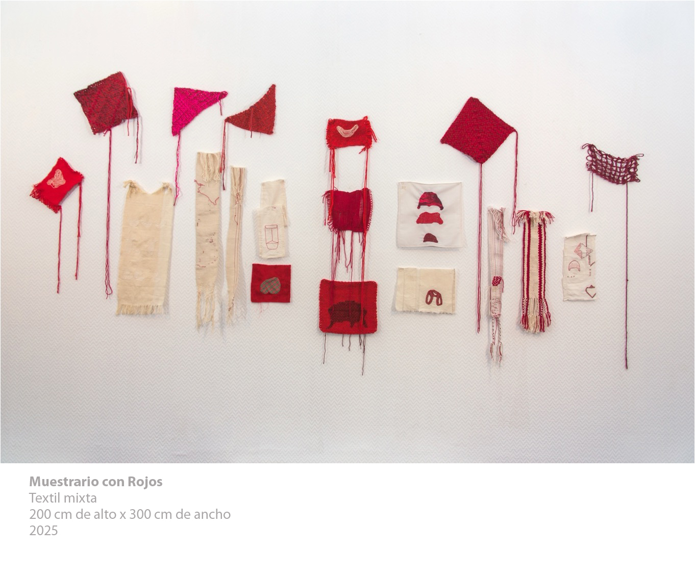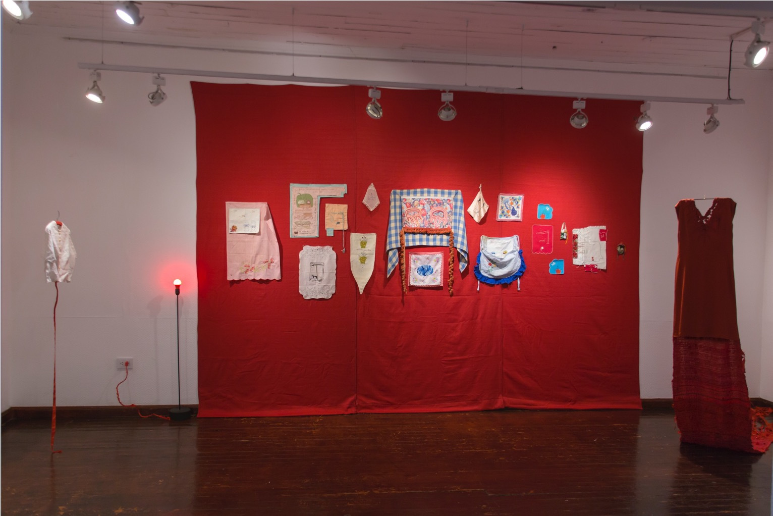 La instalación de la artista María Laura Ise nos invita a recorrer una cartografía visual y emotiva que desprende un aura roja desde los diferentes soportes de sus obras como bordados, dechados, una escena de fotografía digital sublimada de manera manual, un muestrario de pequeñas piezas confeccionadas en telar, dibujos, objetos, corsets, vestidos, textos que despliegan lo poético y político del espacio.