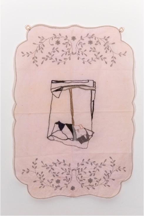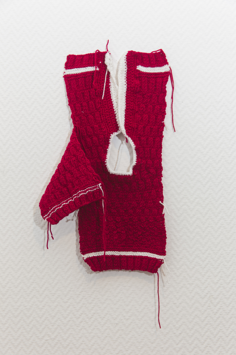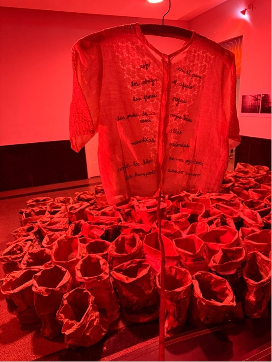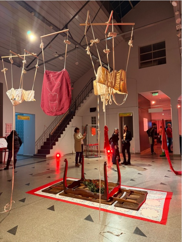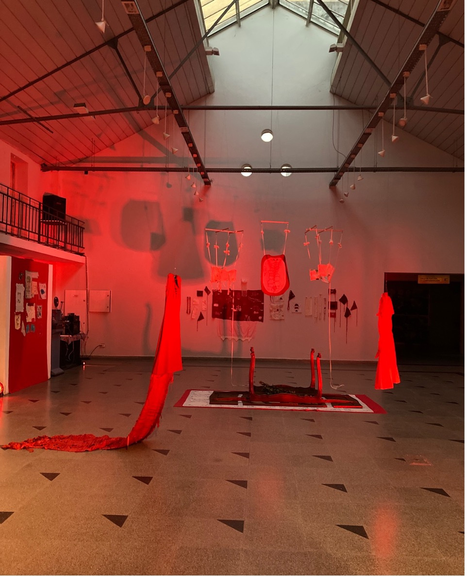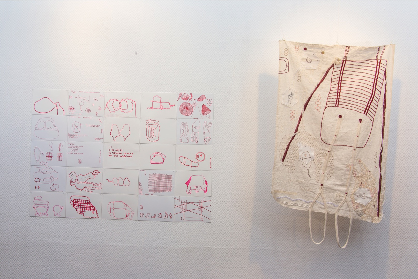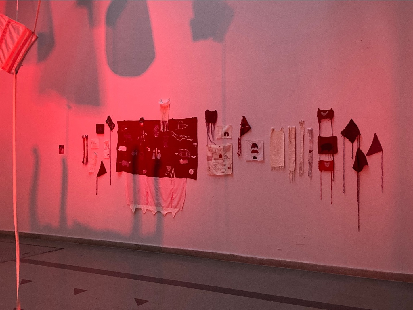 La instalación de la artista María Laura Ise nos invita a recorrer una cartografía visual y emotiva que desprende un aura roja desde los diferentes soportes de sus obras como bordados, dechados, una escena de fotografía digital sublimada de manera manual, un muestrario de pequeñas piezas confeccionadas en telar, dibujos, objetos, corsets, vestidos, textos que despliegan lo poético y político del espacio.