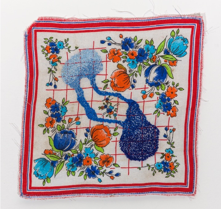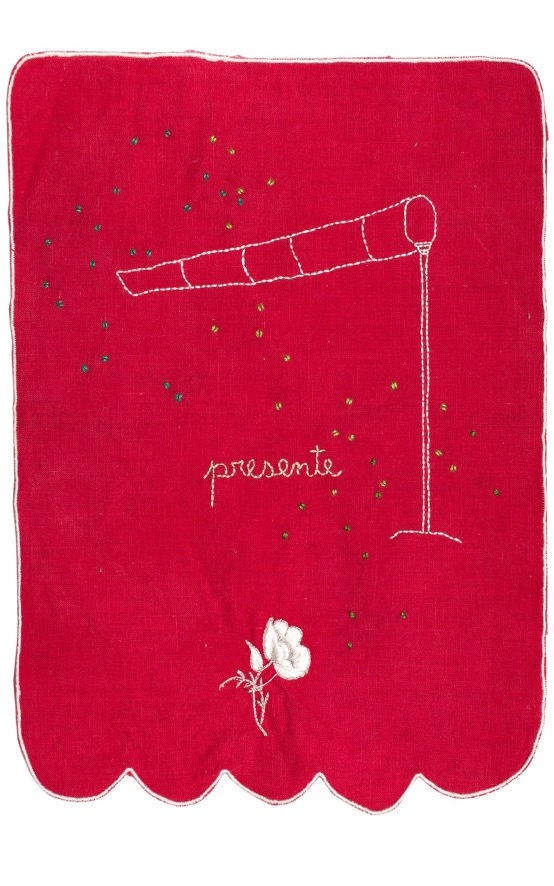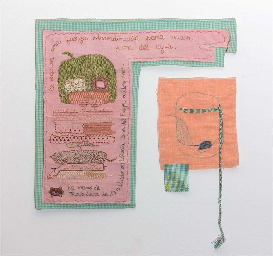 A María Laura la conocí en un espacio de mujeres, un espacio crítico de reflexión, de análisis, de compartir entre nosotras, de mirar nuestras prácticas artísticas a la luz de textos y testimonios de otras, de otros tiempos, de otros lugares. También trabajamos juntas en un colectivo de artistas feministas, hace más de una década, ambas coincidimos en que lo que se aprende al trabajar juntas se queda para toda la vida. Desde entonces nuestros caminos se entrelazan cada tanto, a pesar de estar en distintos países. Algunas de las piezas de esta muestra yo las conocía ya, o en formato de idea o de proceso, conocí algunos pedazos de tela o madejas de hilo que después se volvieron libros, historias o textos potentes, pero que hay que mirar de cerquita y con atención, María Laura parece que trabaja con una lupa que mira para adentro, por eso a veces sus hilos tienen un contenido microscópico que toca mirar con mucha atención. Algunas de estas piezas las miré en video llamada, en más de una videollamada. Miré algunos trazos de hilo como iban caminando, danzando sobre las telas, cada tanto, en varios momentos hasta que los terminó. Ahora me conmueve mirar estos mapas, estos registros, estas cartografías que encierran más de lo que una mirada rápida puede captar. Ahora tengo la impresión de que estamos en medio de una fogata, que fue construida sutilmente, pacientemente, con mucha conciencia, pero que al final arde con intensidad.